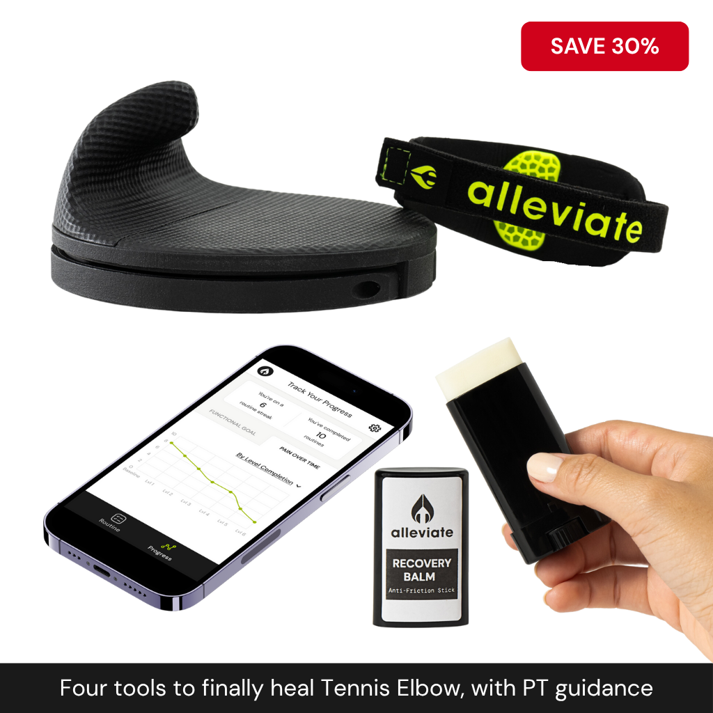 Alleviate was founded by a patient-and-clinician duo to bring the effective chronic pain treatment from physical therapy offices to everyone's home. With our Tennis Elbow System, that includes the Guided Recovery Program, you can use the Alleviate Method to recover from Plantar Fasciitis at home. No physical therapy training required!